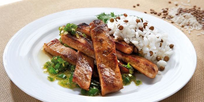 - Pour sauce over pork and fajitas mixing them with white rice and lentils.