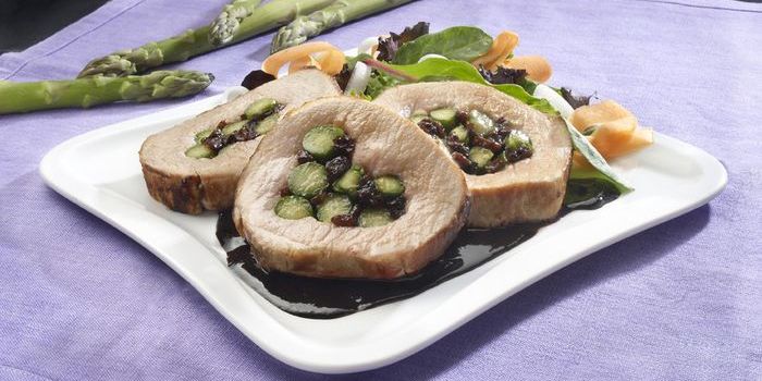 - One loin evenly filled with asparagus and raisins. Tie roles loin with string, season with salt, pepper and garlic, sealing on the griddle until golden brown and bake at 175 degrees for 30 to 40 minutes or until cooked.