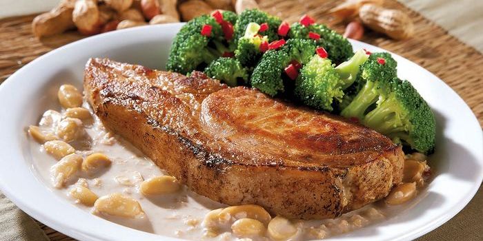 - Garnish the cuts with the sauce adding whole and halved peanuts; steamed broccoli with butter sprinkled with fresh red pepper.