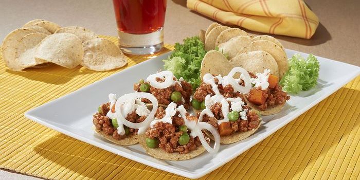 Pork Picadillo toast with cream, cheese and onion rings