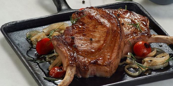 - Sirve una chuleta bañada en cebollas, con un par de tomates cherry rostizados y un poco de puré como guarnición. Decora con hojas de romero.