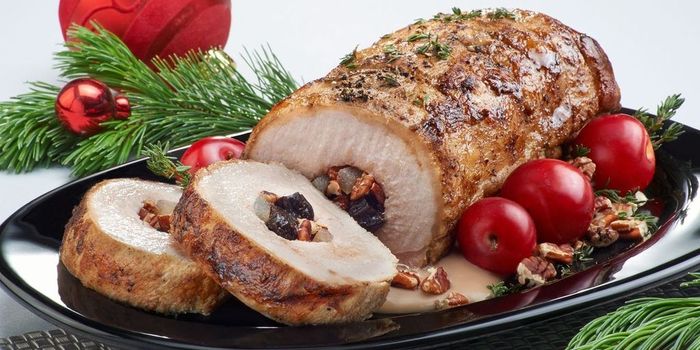 Lomo relleno de nueces, ciruela y acitrón con gravy