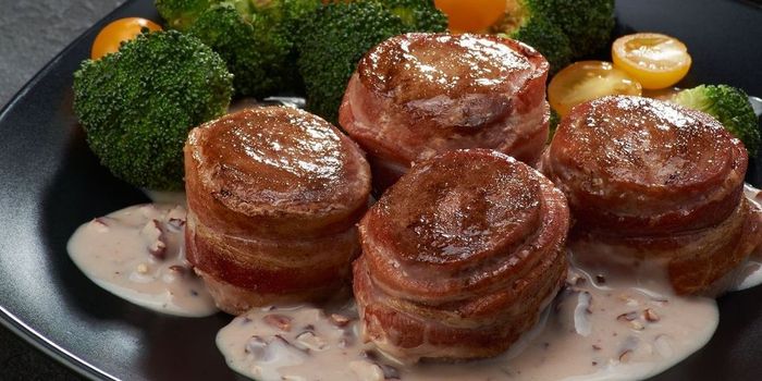 Mignon envuelto en tocino con salsa de nuez