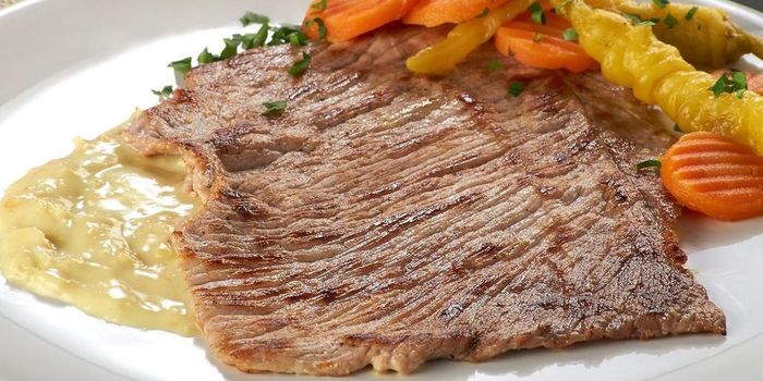 - Para emplatar, coloca una cama de la salsa y encima la milanesa, adorna con un chile y zanahorias enteros.