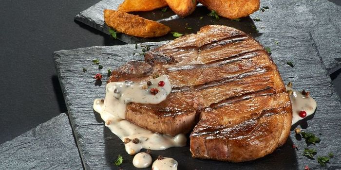 T-Bone a la parrilla con salsa cremosa de pimientas y papas fritas